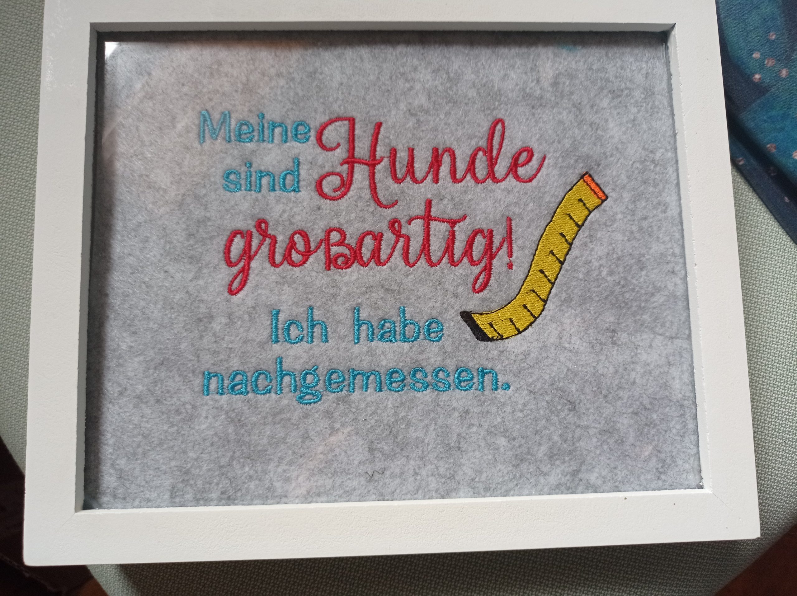 Bilderrahmen mit Sprüchen auf Filz oder Kunstleder gestickt.