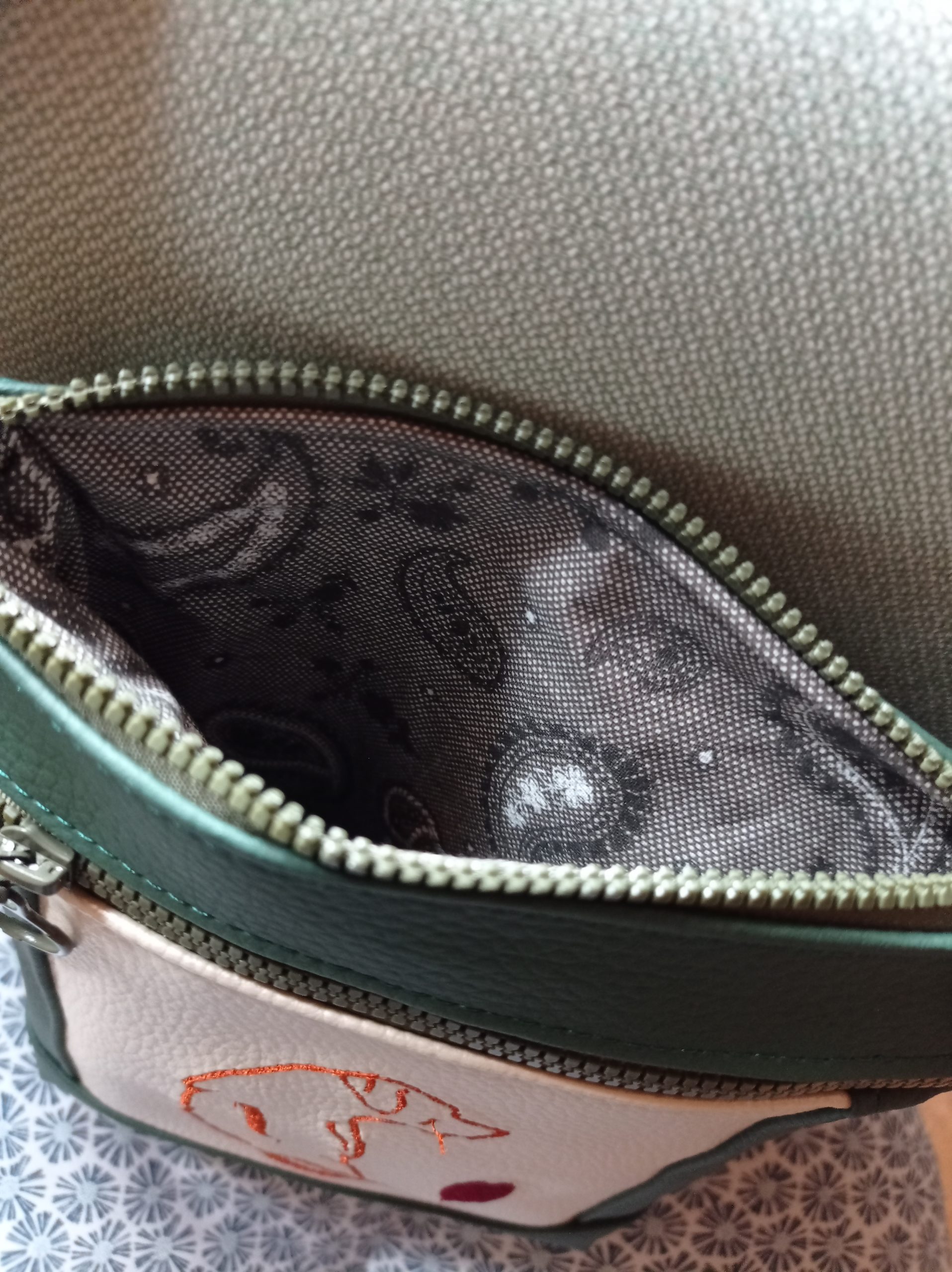 Tolle Gassi-Tasche aus Kunstleder (tannengrün). Zwei Innentaschen mit Reisverschluss. Innenstoff ist aus Baumwolle. Größe ca. 20 x 20 cm. Das Gurtband ist abnehmbar und verstellbar.