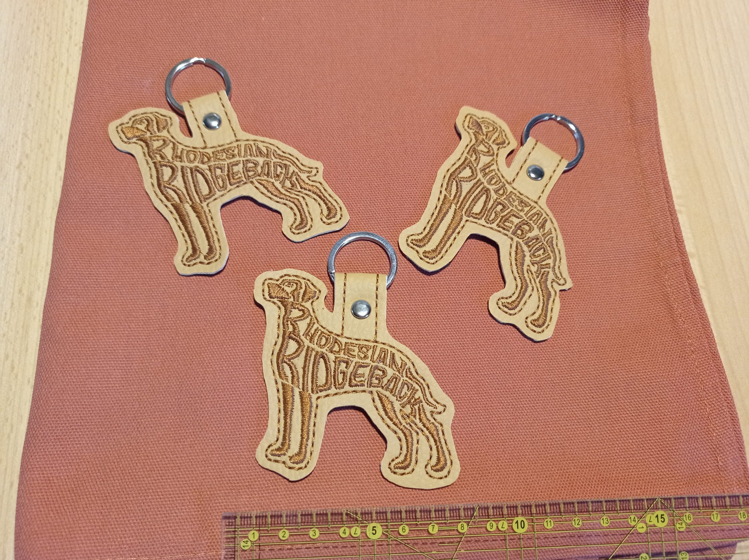 Schöne Schlüsselanhänger Rhodesian Ridgeback auf Kunstleder gestickt.