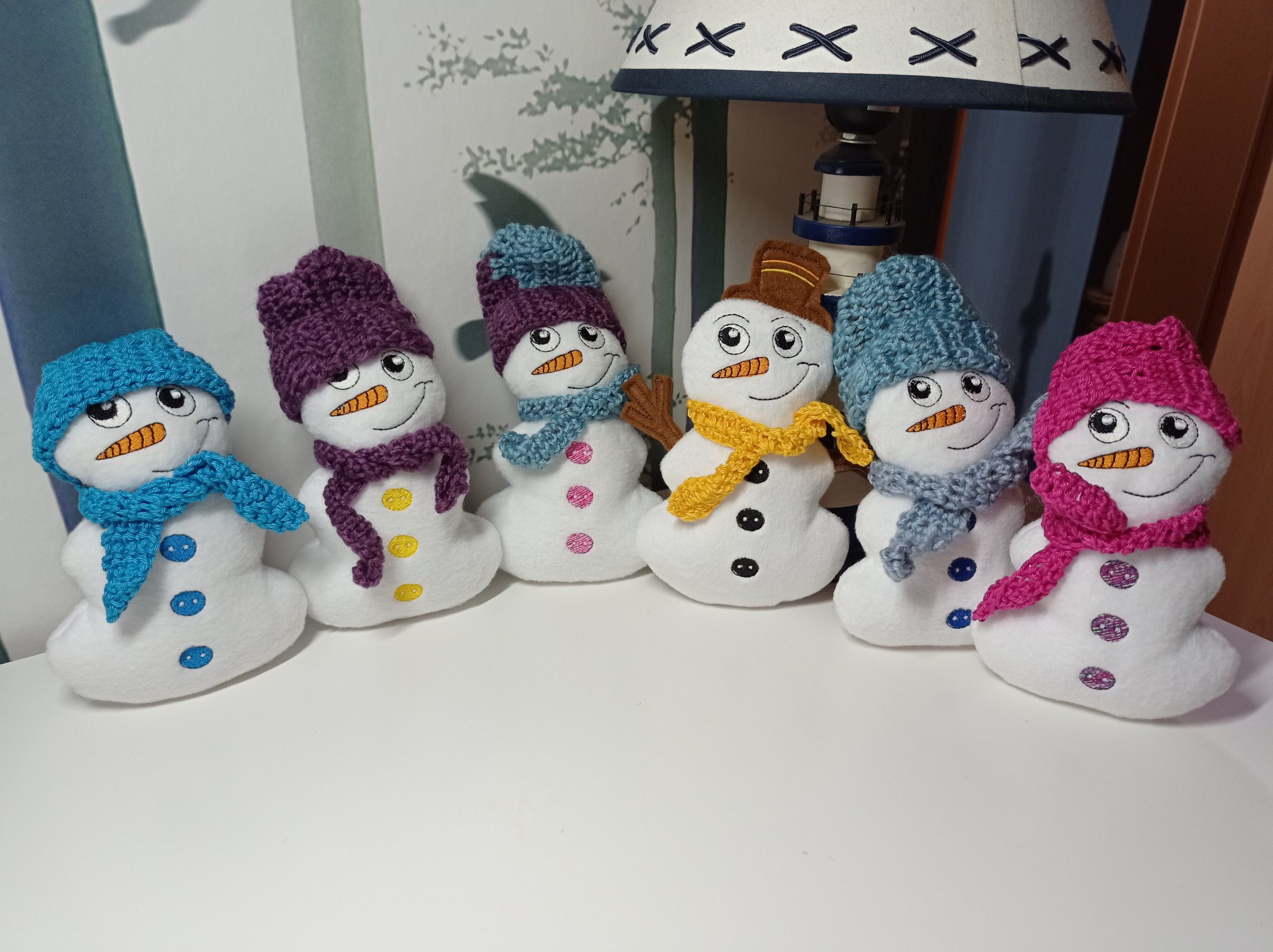 Niedliche kleine Schneemänner aus Fleece-Stoff genäht. Jeder ist ein Unikat. Größe ca. 20 cm (mit Mütze).