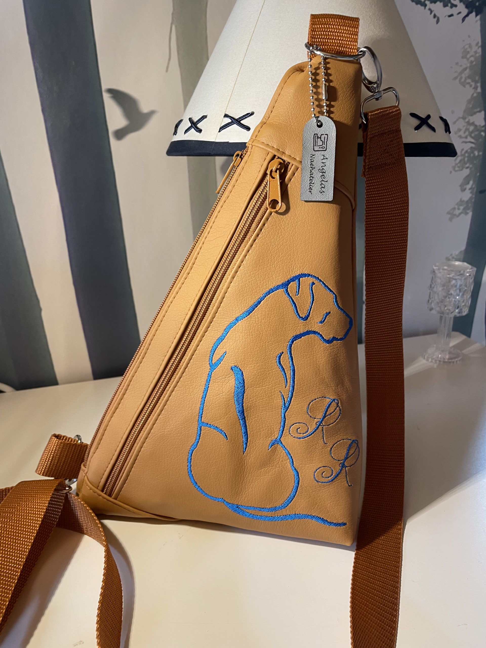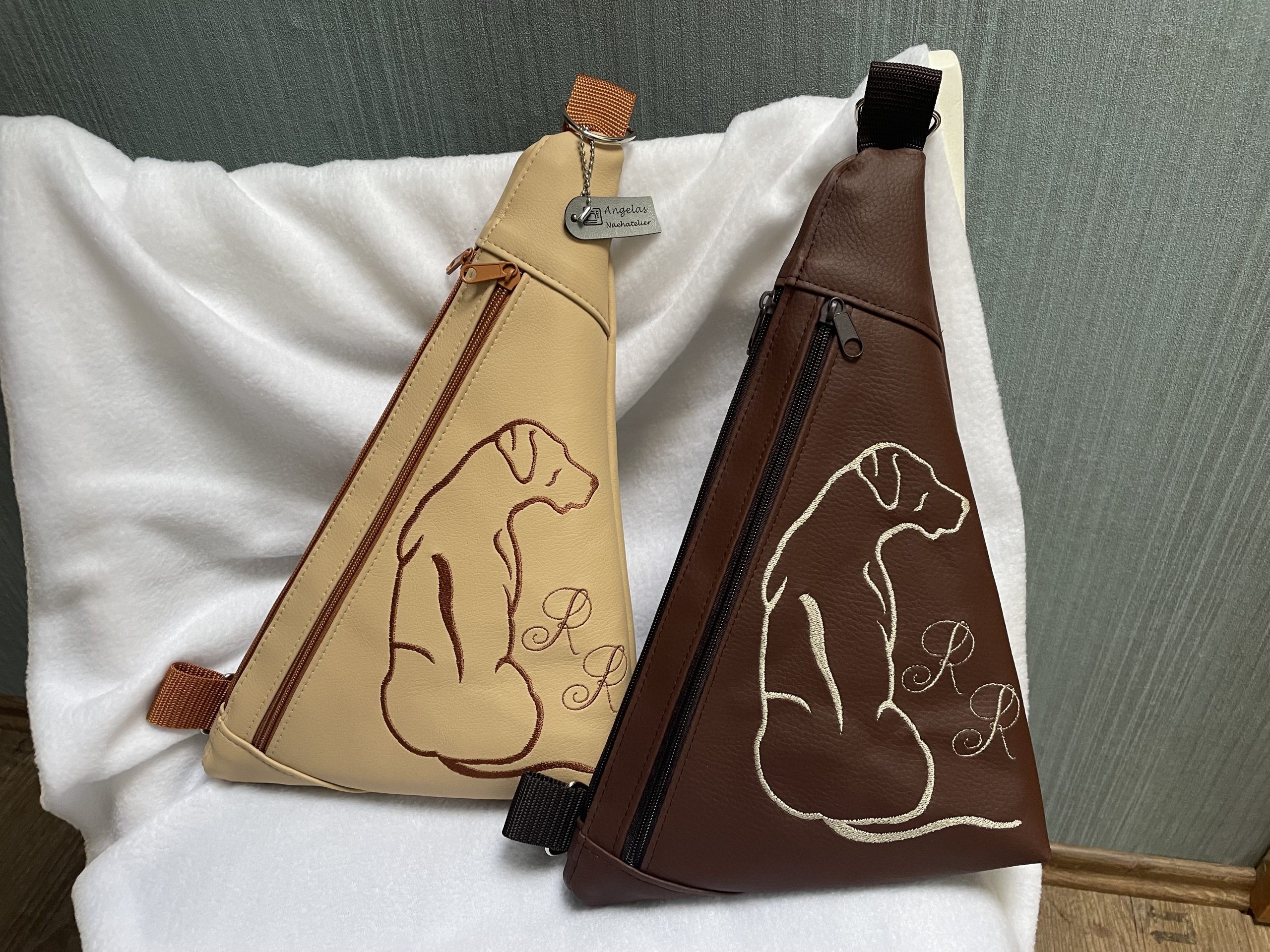 Tolle Slingbag Taschen aus Kunstleder genäht. Zwei Innenfächer mit Reissverschlüssen, innen wasserfester Outdoorstoff. Größe ca. 31 cm hoch, 22 cm breit, 5 cm tief (an der breitesten Stelle). Dieses Modell ist eine kleine, leichte Tasche, die Platz für eine 0,5 Liter Flasche hat. Sie wird quer über einer Schulter auf dem Rücken oder der Brust getragen. Viele andere Hunderassen oder auch andere Motive und Farben machbar. Jede Tasche wird individuell für Euch gefertigt. (Namen und sehr aufwendige Stickbilder gegen Aufpreis)